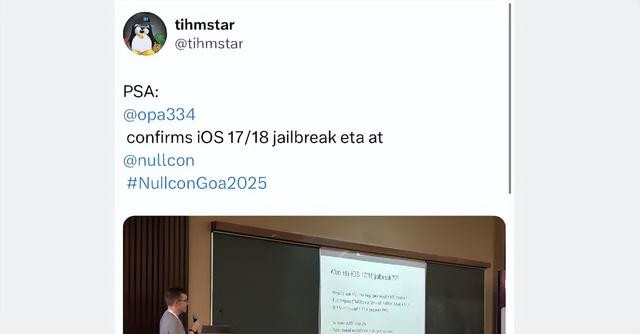 在3月1日下午时段,tihmstar 大神在 X 推特上转发一条关于 opa334 越狱大神演讲,从转发内容来看,提到 iOS 17 和 18 越狱 ETA 预计到达,实则是一条无望的消息,并不是越狱即将发布。