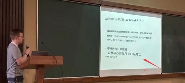 从分享的图片来看,这是 opa334 越狱大神演讲。黑板投影的内容提到,iOS 17 和 18 越狱是无望的,现在已经没有大神公开内核漏洞,越狱接近成为过去式,除非有人公开漏洞,不然永远都不会有越狱。